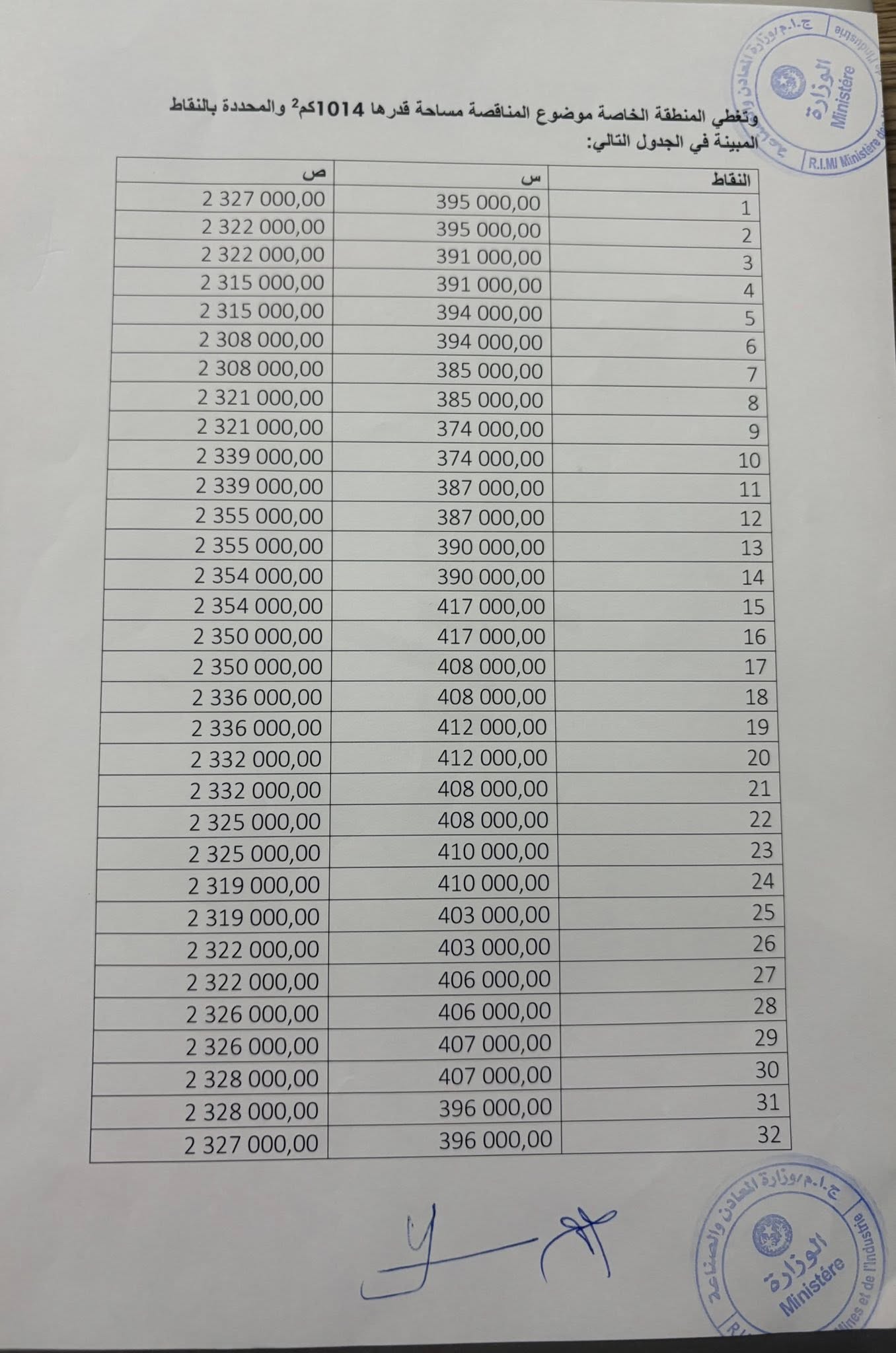 ستُحوّل هذه المنطقة، ذات الاحداثيات المُرفقة بهذا الإعلان، إلى "منطقة خاصة". وعليه، ستُمنح رخص التنقيب المُستقبلية في هذه المنطقة، ليس لمُقدّم الطلب الأول، بل من خلال مناقصة تنافسية، وفقًا لما تنص عليه المادة 35 من المدونة المعدنية.