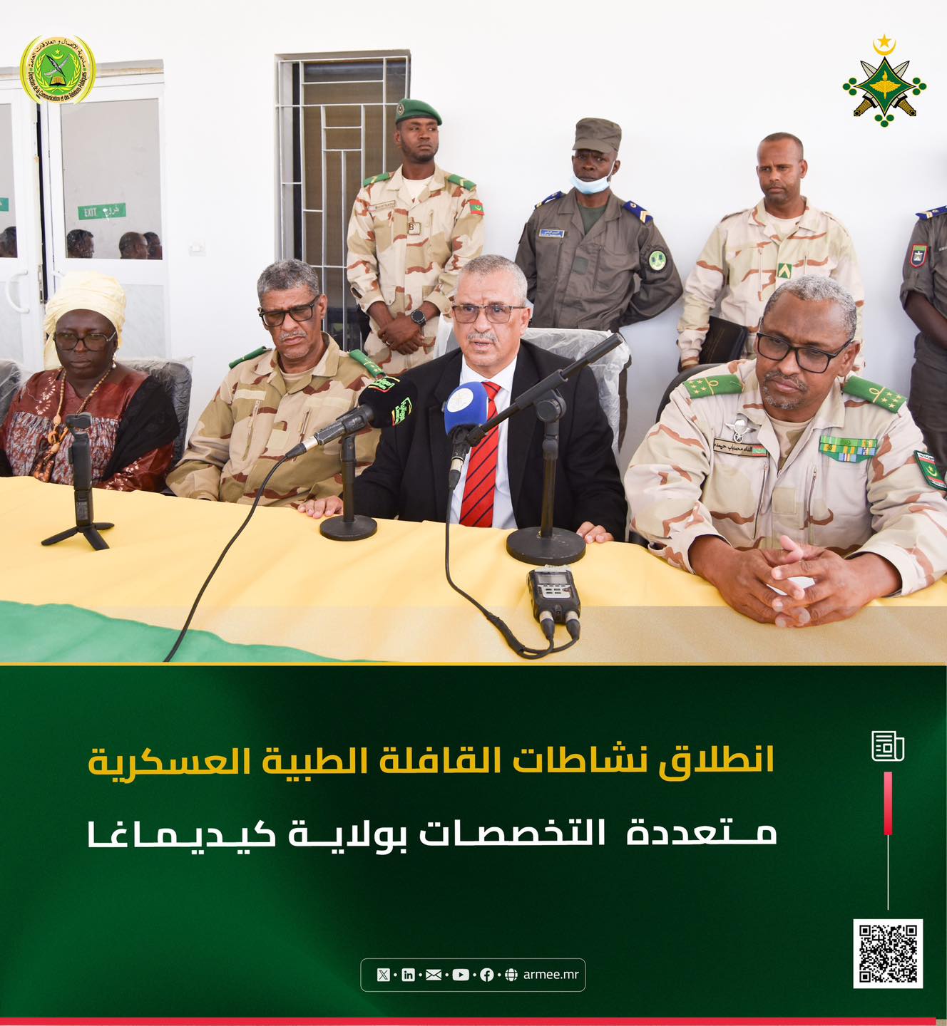 انطلقت اليوم الإثنين 3 نوفمبر 2025، على مستوى مدينة "گُري" بولاية كيديماغا، نشاطات القافلة الطبية العسكرية متعددة التخصصات، التي تنظمها الأركان العامة للجيوش، تحت إشراف والي الولاية؛ السيد دحمان ولد بيروك، رفقة مدير الشؤون الاجتماعية بالأركان العامة للجيوش؛ العقيد الداه محمد باب حيمده، وقائد المنطقة العسكرية الرابعة؛ العقيد محمد سالم يرگ، ونائب رئيس الجهة؛ السيد والي بوبو چاورا، وحاكم مقاطعة غابو؛ السيد محمد محمود ولد القاسم، وعمدة گوري؛ السيدة هاچرتو با، وبحضور السلطات العسكرية والأمنية بالمدينة.