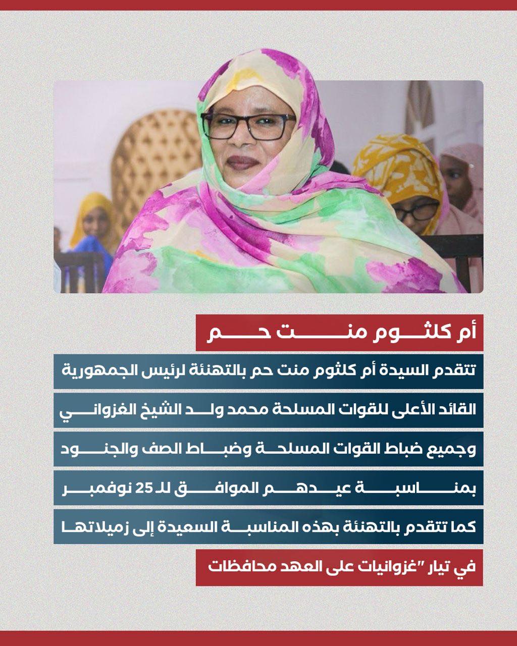 في سابقة هي الأولى من نوعها في تاريخنا الوطني، استوقفتنا التهنئة الكريمة للسيدة أم كلثوم حمه، حرم قائد أركان الحرس الوطني الفريق إبراهيم فال الشيباني، بتهنئتها الصادقة للمؤسسة العسكرية والأمنية بمناسبة ذكرى الاستقلال.