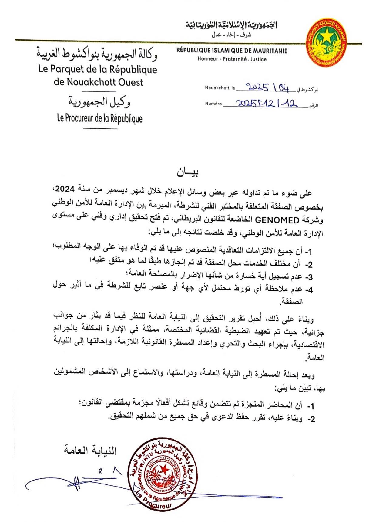 قررت النيابة العامة في نواكشوط الغربية حفظ الدعوى في حق جميع من شملهم التحقيق بخصوص الصفقة المتعلقة بالمختبر الفني للشرطة، المبرمة بين الإدارة العامة للأمن الوطني وشركة GENOMED الخاضعة للقانون البريطاني.