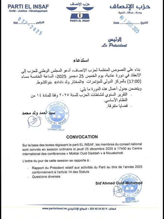 دعا رئيس حزب الإنصاف سيد أحمد ولد محمد المجلس الوطني لعقد دورة عادية يوم الخميس 25 دجمبر الجاري المركز الدولي للمؤتمرات "المختار ولد داداه" بانواكشوط.