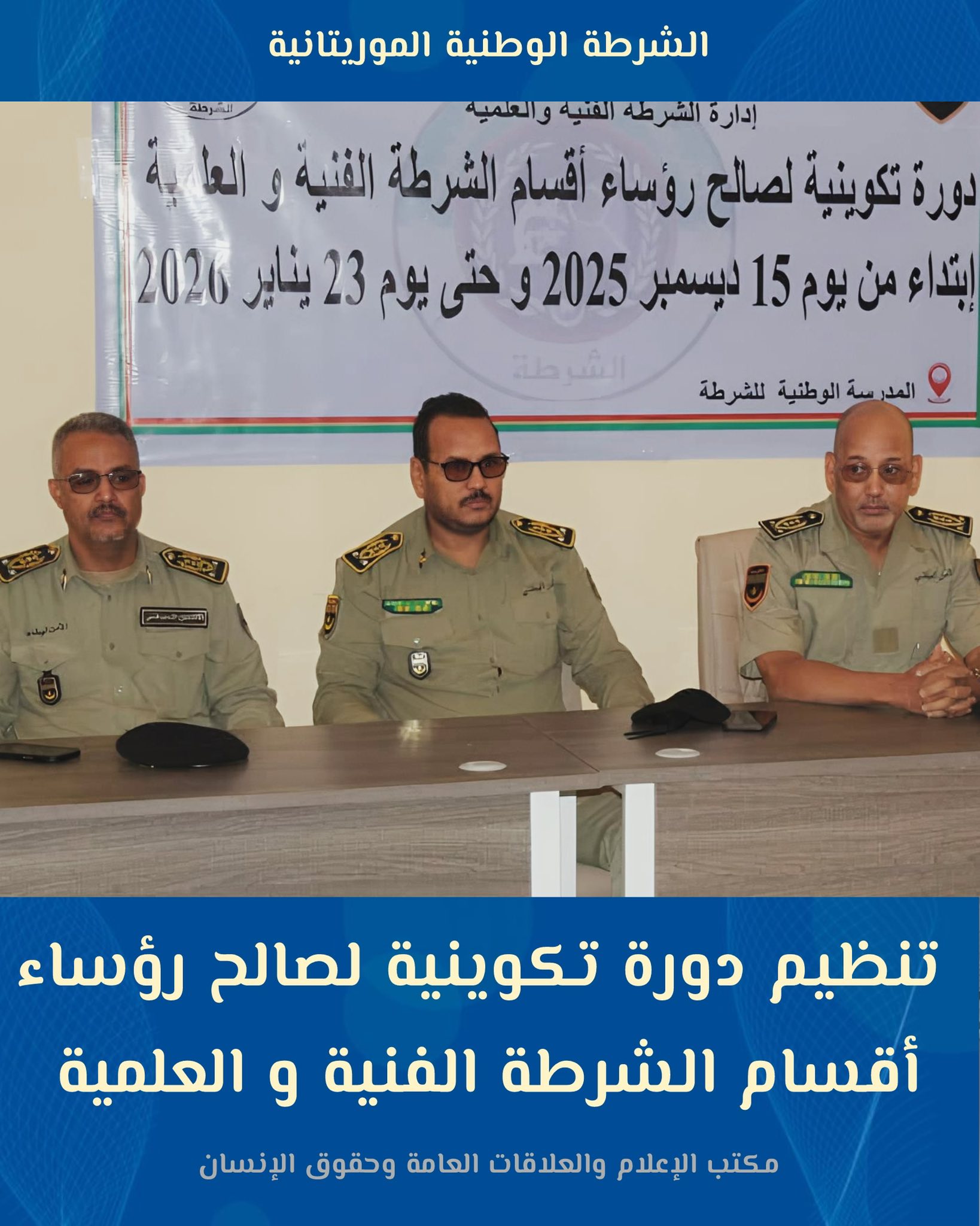 تم يوم الإثنين 15 دجمبر 2025 افتتاح دورة تكوينية لصالح 39 فردا من رؤوساء أقسام الشرطة الفنية و العلمية في المدرسة الوطنية للشرطة من طرف مدير الشرطة الفنية و العلمية المفوض الرئيس أحمد سالم ولد مولاي بحضور مدير المدرسة الوطنية للشرطة المفوض الإقليمي محمد ولد احمد جدو ومدير المصادر البشرية والتكوين المفوض الرئيس الداه ولد بلاله ، حيث تم استعراض أهداف الدورة التدريبية المتمثلة في تعزيز المعارف والمهارات المهنية لتقنيي مسرح الجريمة، وربط آليات العمل والتنسيق مع الإدارة المختصة.