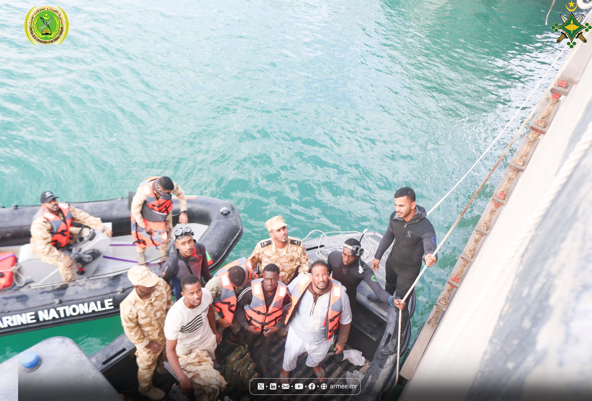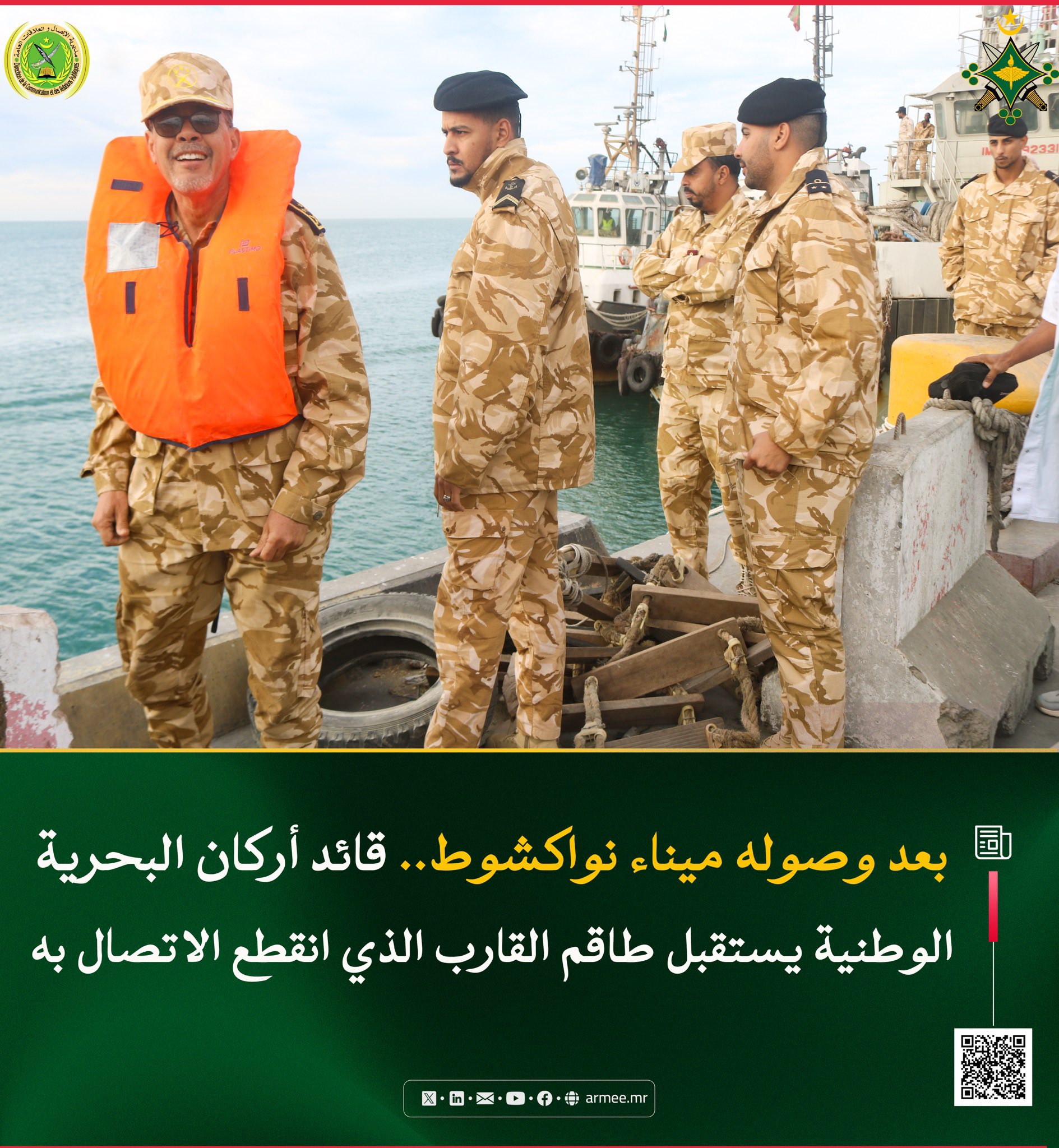 استقبل الفريق البحري أحمد السيد بنعوف؛ قائد أركان البحرية الوطنية، رفقة عدد من قادة المكاتب والمصالح التابعة لأركان البحرية، صباح اليوم الجمعة 23 يناير 2026، على رصيف ميناء الصداقة بنواكشوط، طاقم القارب الذي انقطع الاتصال به ليلة 20 إلى 21 يناير 2026، قبل العثور عليه مساء أمس الخميس، إثر عملية بحث وإنقاذ ناجحة.