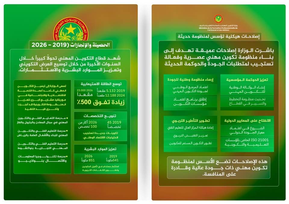 وأكد ولد الغزواني أن السنوات الأخيرة شهدت جهودا مكثفة لتطوير التكوين المهني، تضمنت توسيع شبكة المؤسسات، وإنشاء مراكز جديدة في مختلف الولايات، وتأهيل الكوادر وتكييف البرامج التدريبية مع متطلبات سوق العمل.