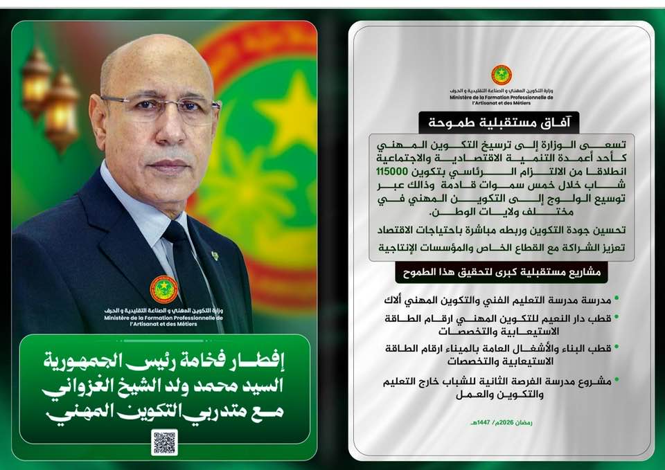 ويأتي هذا الإفطار تجسيدا للعناية الخاصة التي يوليها فخامة رئيس الجمهورية لقطاع التكوين المهني، باعتباره رافعة أساسية للتنمية الاقتصادية والاجتماعية، ومصدرا مهما لتوفير فرص التشغيل، فضلا عن كونه دعامة رئيسية للتحول الاقتصادي عبر إعداد يد عاملة مؤهلة تستجيب لمتطلبات سوق العمل وتواكب التطورات العلمية والتقنية المتسارعة.