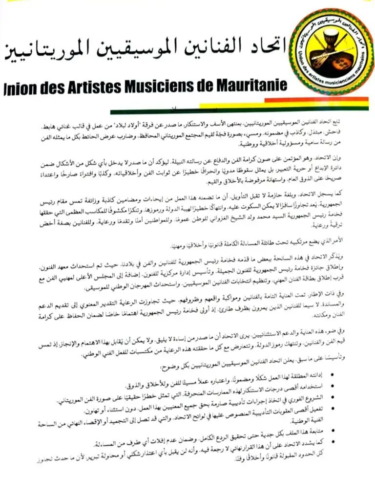تابع اتحاد الفنانين الموسيقيين الموريتانيين، بمنتهى الأسف والاستنكار، ما صدر عن فرقة "أولاد لبلاد" من عمل في قالب غنائي هابط، فاحش، مبتذل، وكاذب في مضمونه، ومسيء بصورة فجّة لقيم المجتمع الموريتاني المحافظ، وضارب عرض الحائط بكل ما يمثله الفن من رسالة سامية ومسؤولية أخلاقية ووطنية.