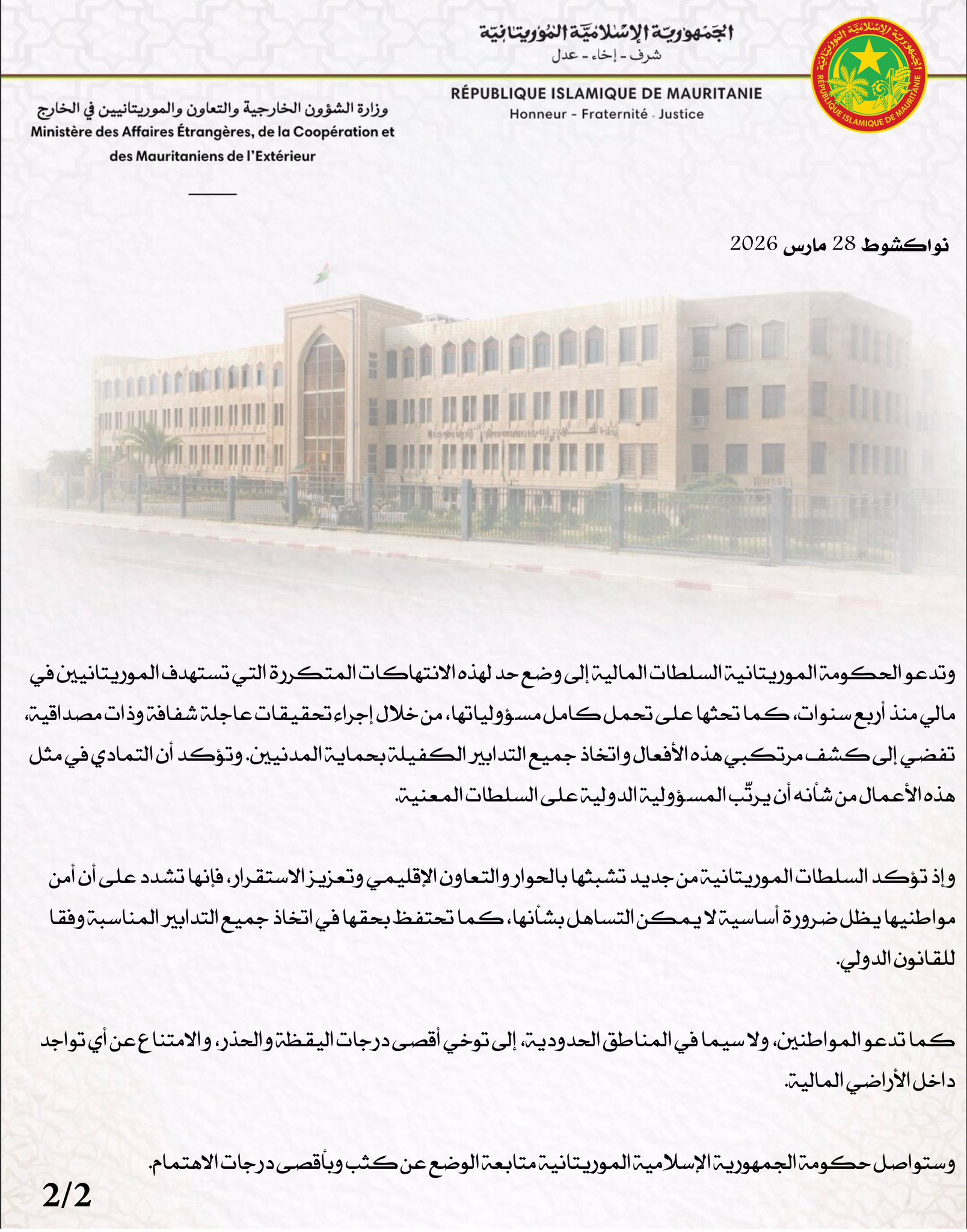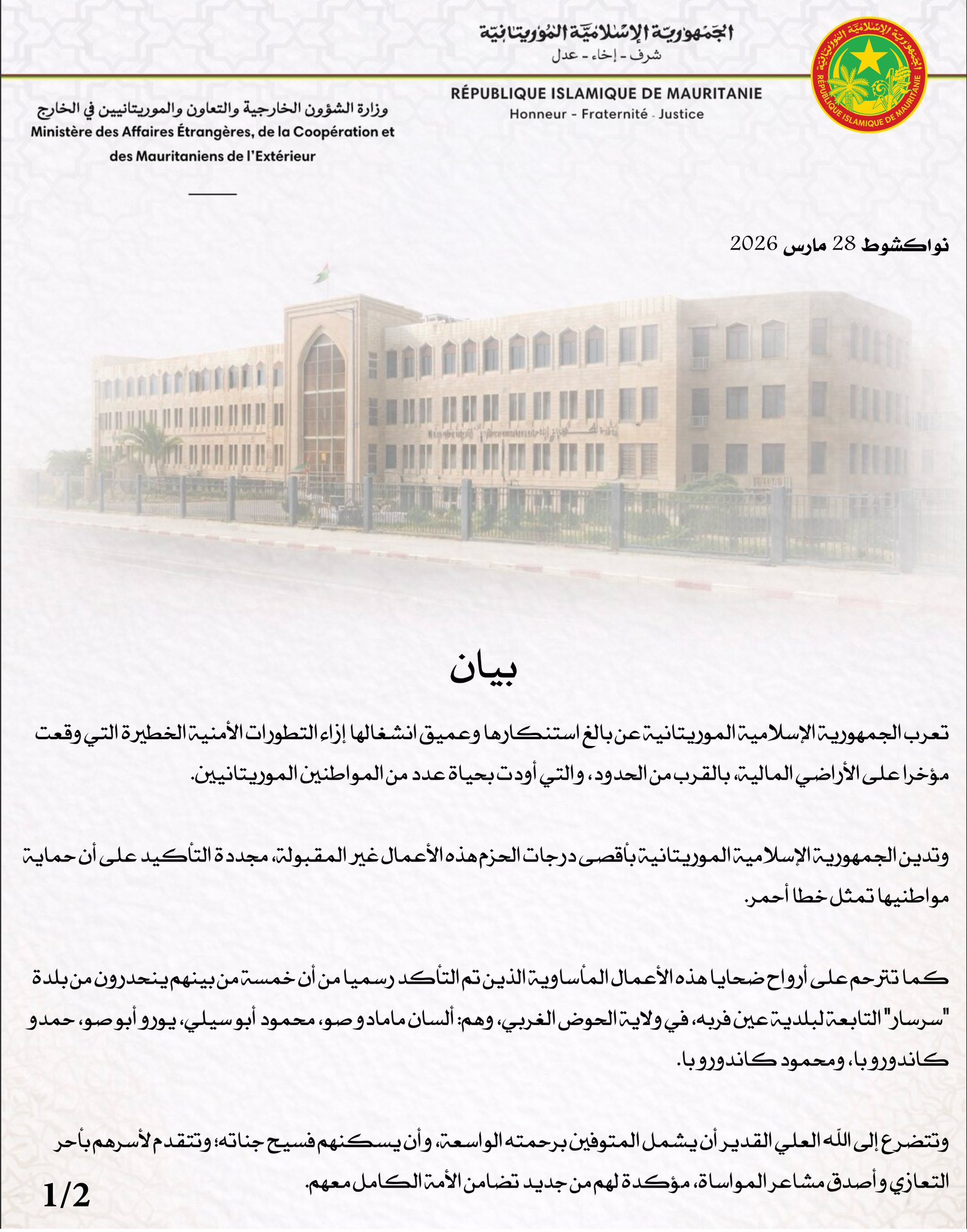 “تعرب الجمهورية الإسلامية الموريتانية عن بالغ استنكارها وعميق انشغالها إزاء التطورات الأمنية الخطيرة التي وقعت مؤخرا على الأراضي المالية، بالقرب من الحدود، والتي أودت بحياة عدد من المواطنين الموريتانيين.