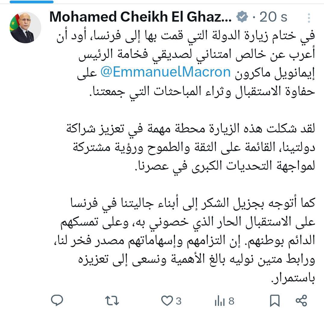 “في ختام زيارة الدولة التي قمت بها إلى فرنسا، أود أن أعرب عن خالص امتناني لصديقي فخامة الرئيس إيمانويل ماكرون EmmanuelMacron@ على حفاوة الاستقبال وثراء المباحثات التي جمعتنا.