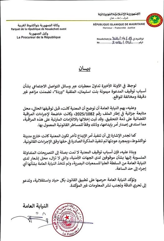 أصدرت النيابة العامة في نواكشوط الغربية بيانا أوضحت فيه ملابسات توقيف المدعوة ميمونة بنت اسليمان، المعروفة بـ“وردة”، نافية ما تم تداوله على بعض منصات التواصل الاجتماعي بشأن أسباب توقيفها.