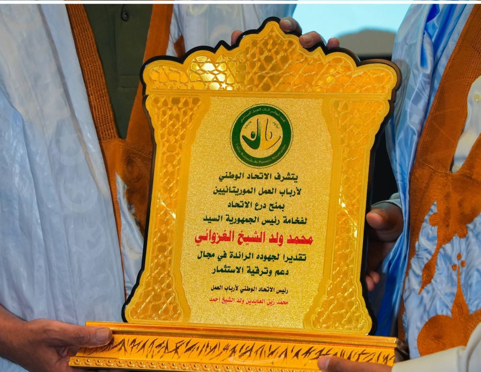 استلم معالي وزير المعادن والصناعة، السيد أدي ولد الزين، تكريمًا من الاتحاد الوطني لأرباب العمل الموريتانيين موجّهًا إلى فخامة رئيس الجمهورية، السيد محمد ولد الشيخ الغزواني، وذلك تقديرًا لقيادته لمسار التحول الصناعي الذي تشهده البلاد.
