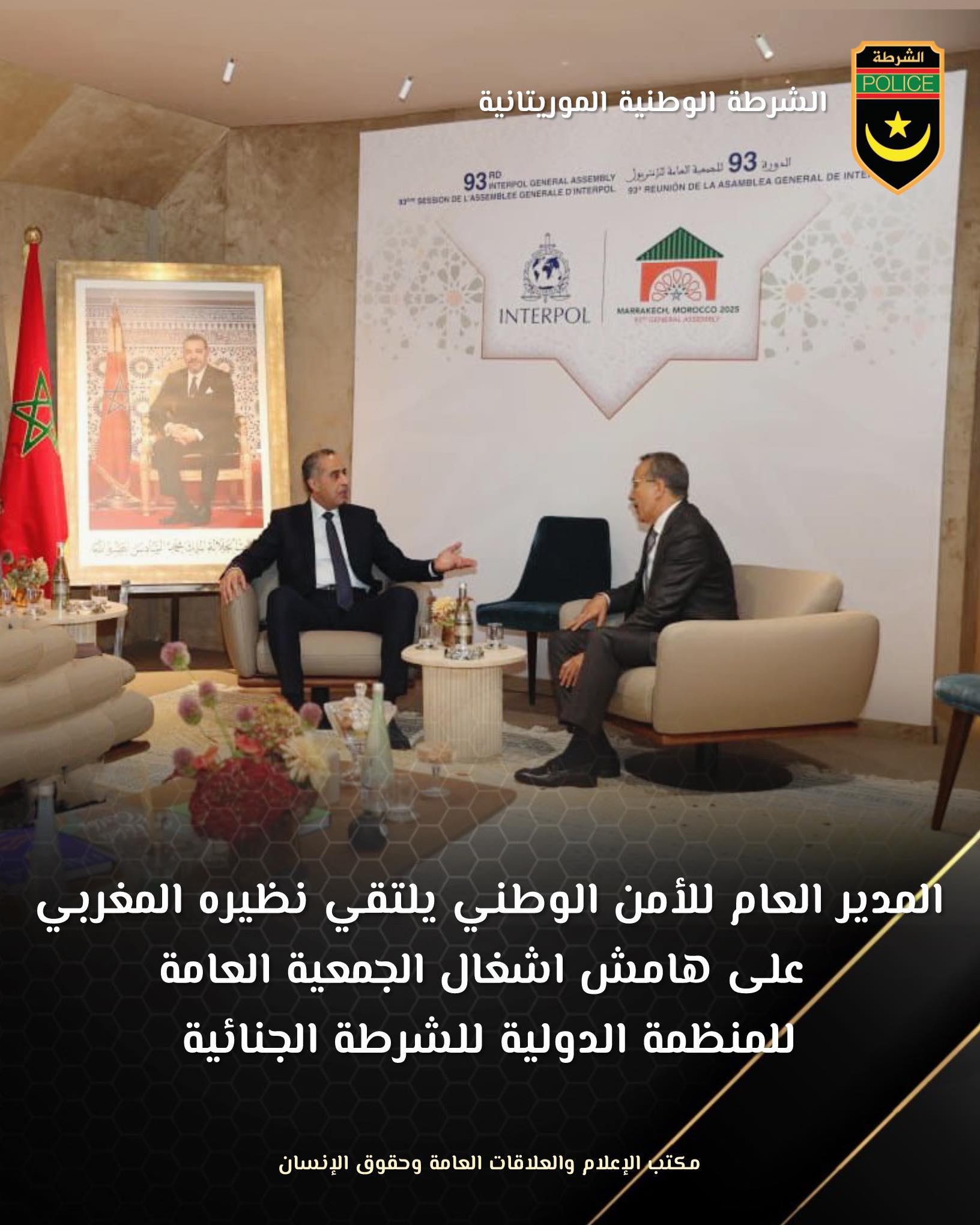 عقد المدير العام للأمن الوطني الفريق محمد لحريطاني اجتماعا مع نظيره المغربي المدير العام للأمن الوطني ولمراقبة التراب الوطني عبد اللطيف حموشي اثناء اشغال الجمعية العامة للمنظمة الدولية للشرطة الجنائية التي احتضنتها مدينة مراكش خلال الفترة الممتدة ما بين 24 و27 نوفمبر 2025.