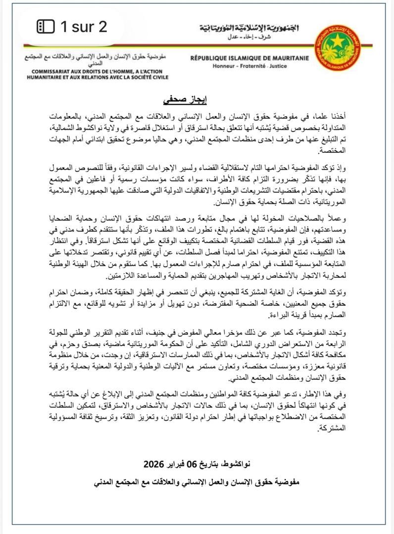 أخذنا علما، في مفوضية حقوق الإنسان والعمل الإنساني والعلاقات مع المجتمع المدني، بالمعلومات المتداولة بخصوص قضية يُشتبه أنها تتعلق بحالة استرقاق أو استغلال قاصرة في ولاية نواكشوط الشمالية، تم التبليغ عنها من طرف إحدى منظمات المجتمع المدني، وهي حاليا موضوع تحقيق ابتدائي أمام الجهات المختصة.