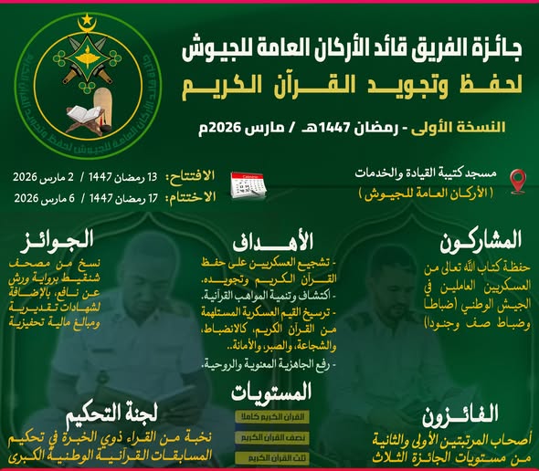 الجيش الموريتاني يطلق مسابقة "جائزة قائد الأركان العامة للجيوش لحفظ وتجويد القرآن الكريم"